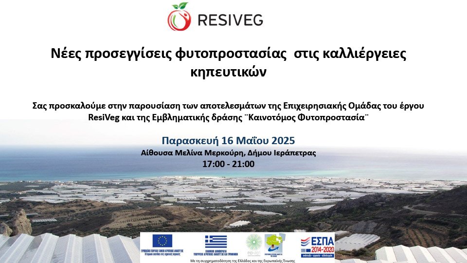 Σας προσκαλούμε στην παρουσίαση των αποτελεσμάτων της Επιχειρησιακής Ομάδας του έργου ResiVeg και της Εμβληματικής δράσης “Καινοτόμος Φυτοπροστασία“. Παρασκευή 16 Μαΐου 2025 Αίθουσα Μελίνα Μερκούρη,…